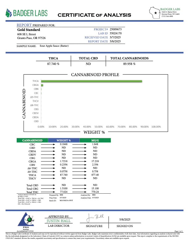 The THCa concentration in Sour Apple Sauce Badder is 87.74% and total Cannabinoids present are 89.95%.
