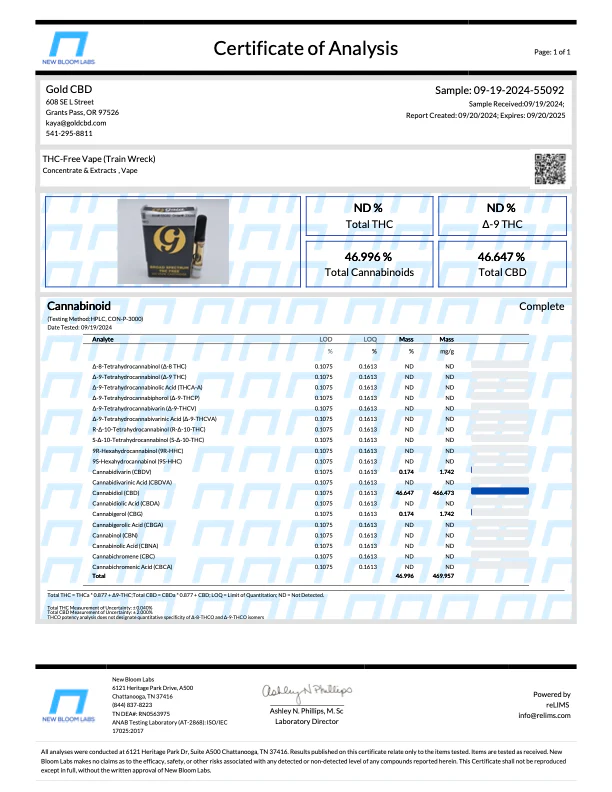 Ingredients: THC-free broad spectrum CBD distillate, MCT oil, and Trainwreck terpenes.